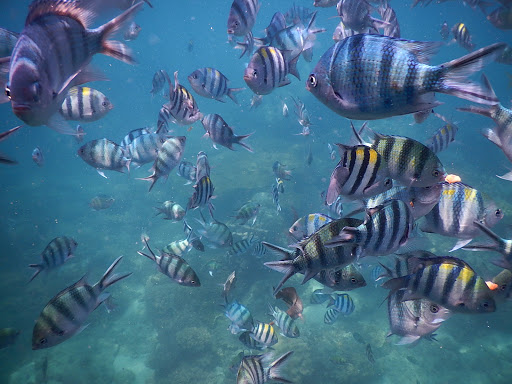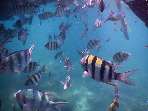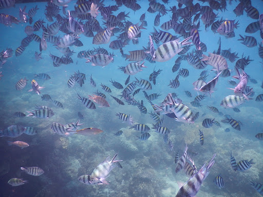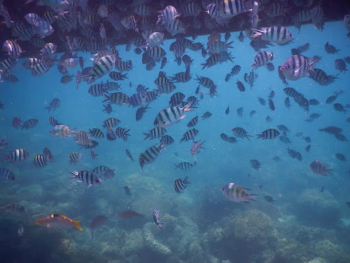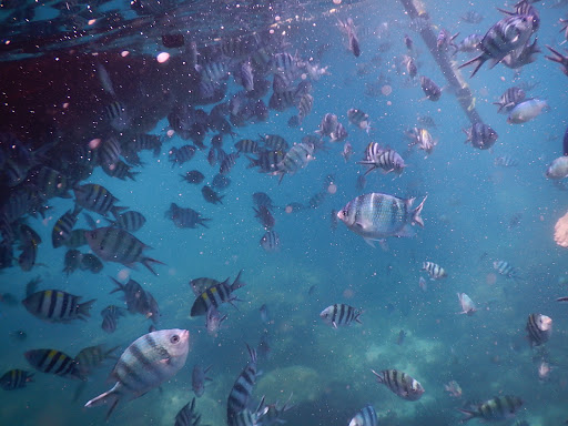 Tampak ikan berdekatan kearah kapal dimana abang dan evan sedang “kasih makan fish!”