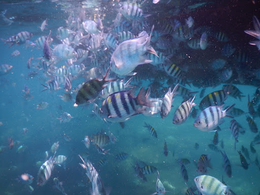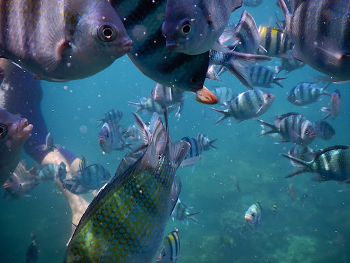 Setelah Pulau Lengkuas, kami ke area snorkeling. Selain nyemplung di air yang dangkal dalam kedalaman hanya 4 meter, kami juga dapat memberi makan pada ikan.