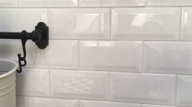 Dan untuk sebagian tembok dapur dan area basah, karena kami menyatukan tempat cuci baju kami memilih bavel putih ini.
