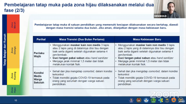 Ada beberapa proses pengambilan keputusan untuk dapat mulai proses pembalajaran tatap muka. Apakah daerah sekolah masuk zona hijau ? Apakah mendapat izin dari Pemda setempat ? Apakah sekolah telah diperiksa dan siap pembelajaran tatap muka ? Dan apakah orangtua murid setuju untuk pembelajaran tatap muka. Keempat tahapan tersebut harus dilewati dan dipenuhi.